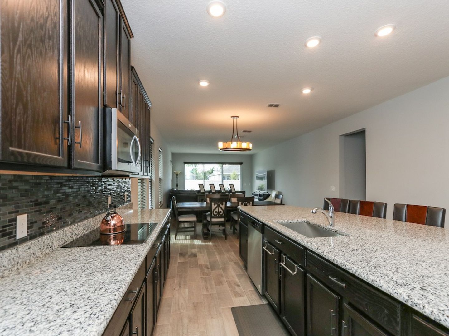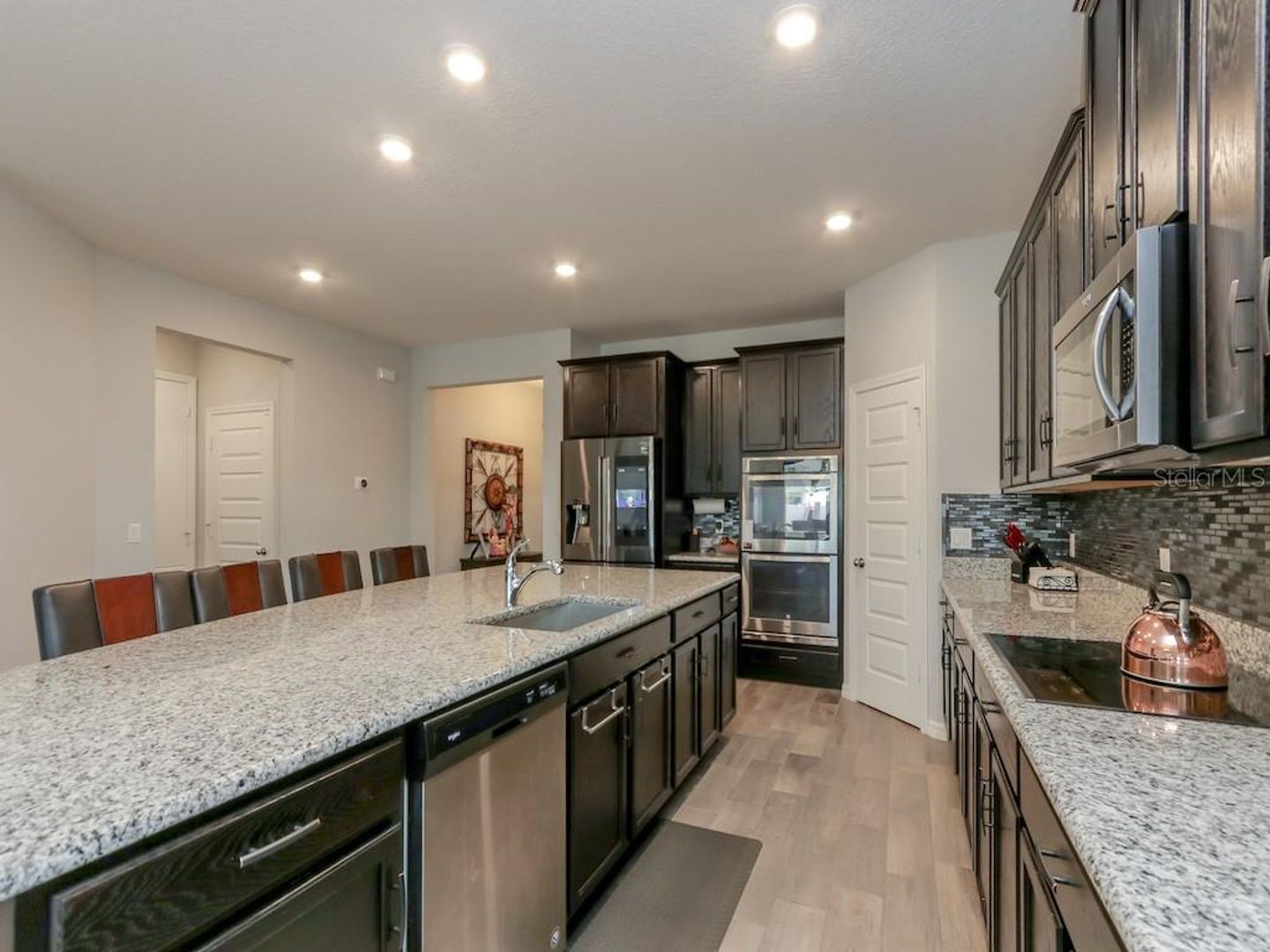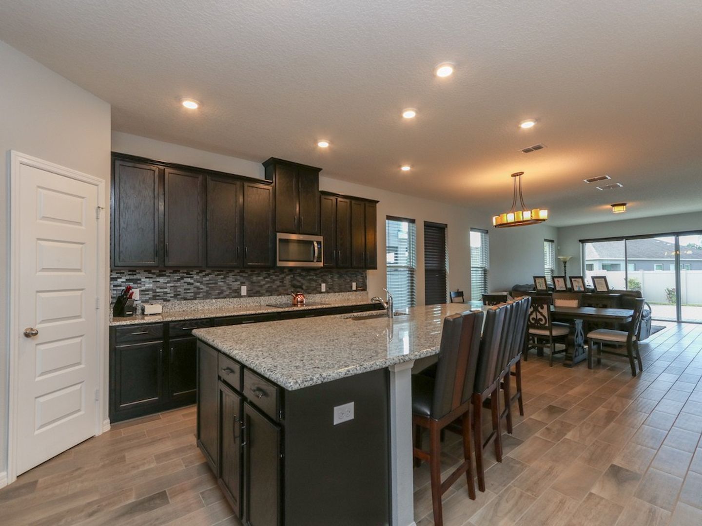 continue throughout the house. THE GREAT ROOM has sliding glass doors to access a covered lanai. The KITCHEN islands, 42" cabinets with